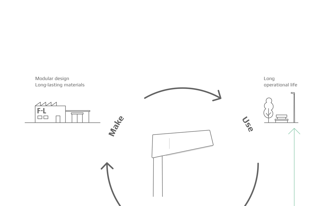 With our Take Back Concept we offer the most sustainable solution within circularity. We aim at securing that the luminaires we bring to market are servicable during their operational life, that components can be reused in new luminaires, materials be recycled, or that old luminaires get a 2nd life.