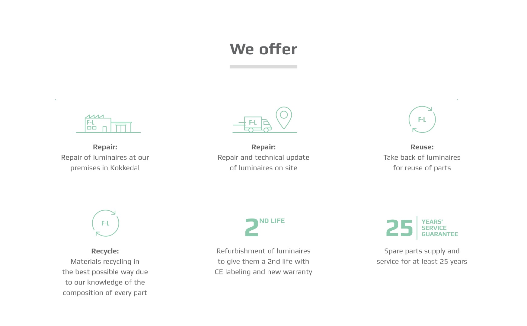 Recycle & Service Center: We take responsibility and open up for taking luminaires back for renovation or sustainable reuse of components and materials.