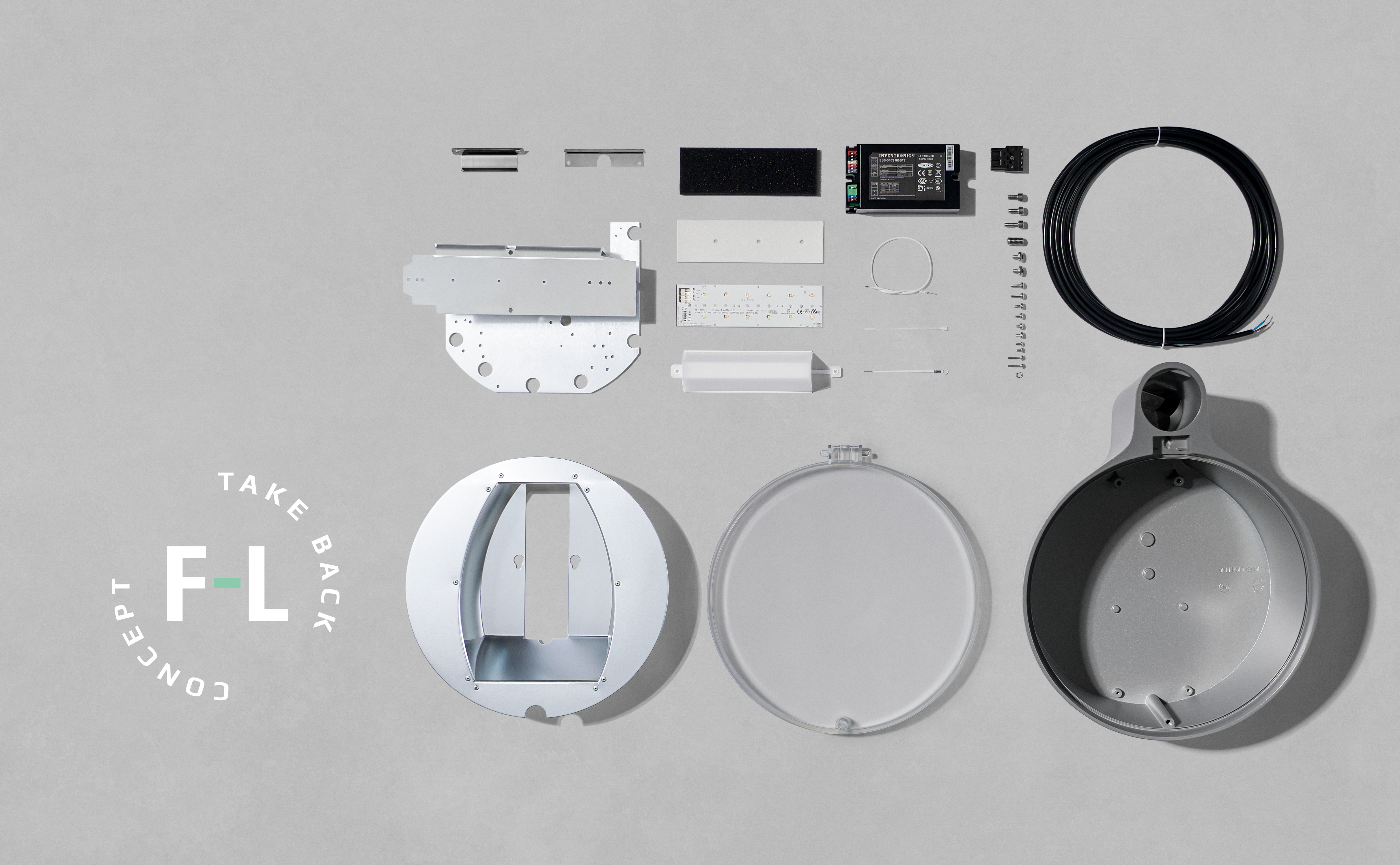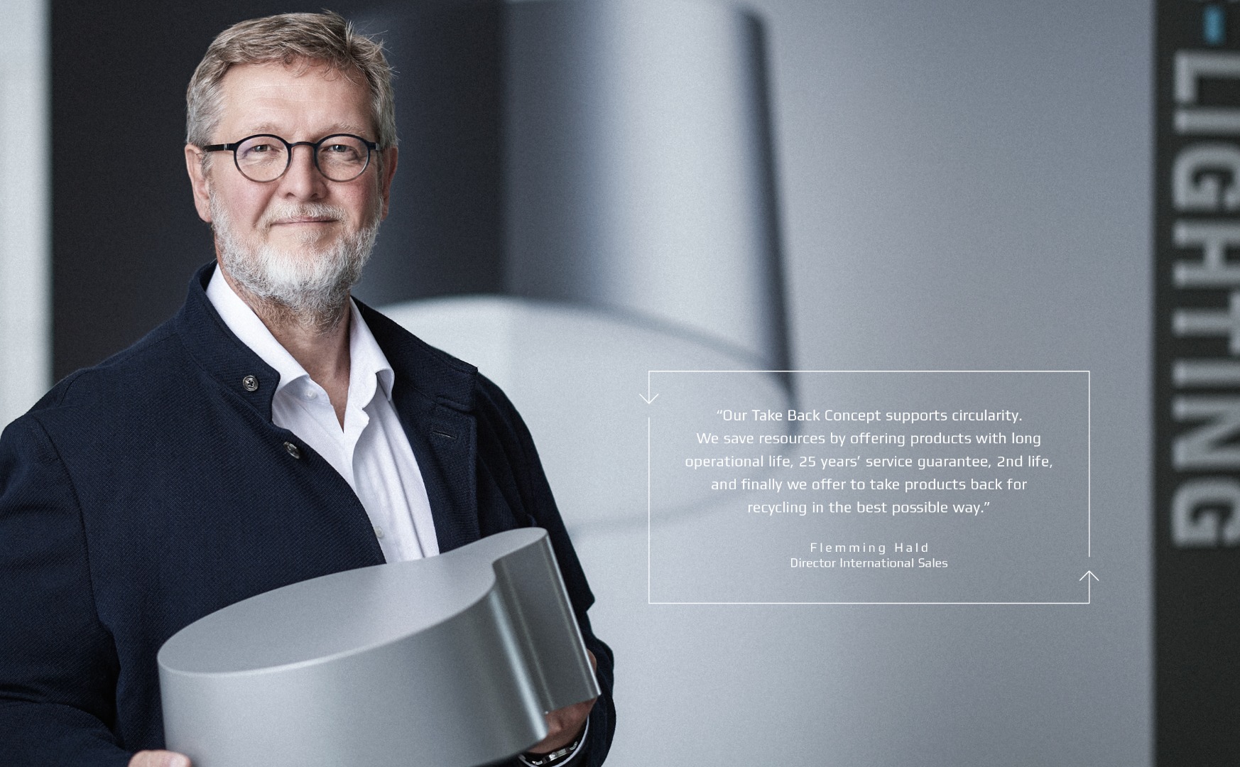With our Take Back Concept we offer the most sustainable solution within circularity. We aim at securing that the luminaires we bring to market are servicable during their operational life, that components can be reused in new luminaires, materials be recycled, or that old luminaires get a 2nd life.